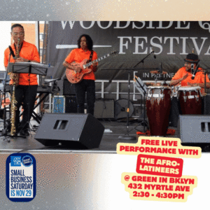 Green in BKLYN hosts The Afro-Latineers known for their energetic, joyful rhythms. Led by percussionist Paul “Sabor” Rivera, the Afro-Latin jazz ensemble draws inspiration from legends like Mongo Santamaría, Machito & The Afro-Cubans, Stevie Wonder, and Fela Kuti. Enjoy this free live outdoor performance with some holiday favorites mixed in as part of Myrtle Avenue’s Small Business Saturday celebration.