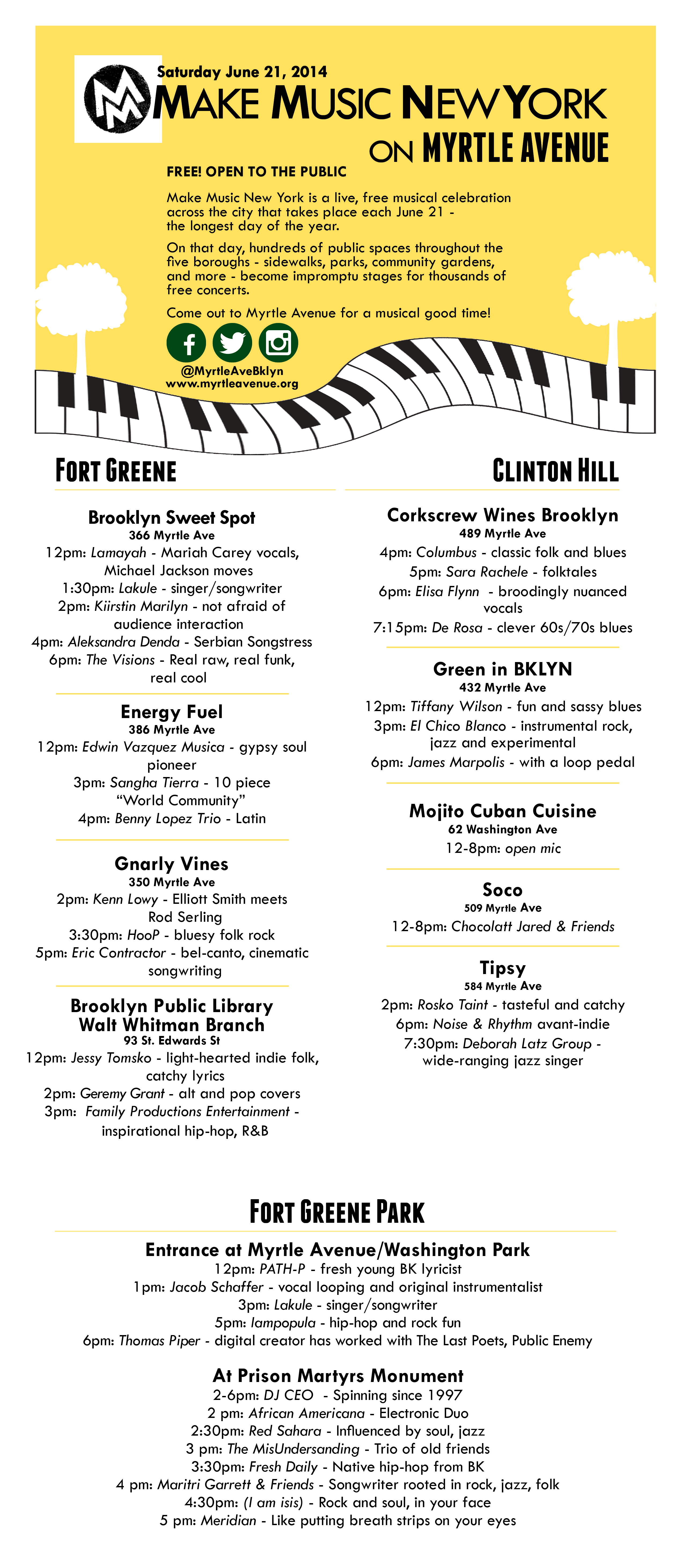 Make Music New York takes place each year on the summer solstice, June 21st, the longest day of the year. On that day, hundreds of public spaces throughout the five boroughs – sidewalks, parks, community gardens, and more – become impromptu stages for over 1,000 free concerts. From 10am to 8pm fifteen Myrtle Avenue area businesses, including restaurants, cafes, shops, boutiques and the Fort Greene Park (entrance at southeast corner of Washington Park & Myrtle Avenue) will be hosting live music.  Over 30 musicians will represent various music genres, including soul, Latin, R&B, folk, bluegrass, jazz, pop and neo-soul. Come out and groove to the music and stroll the Avenue.